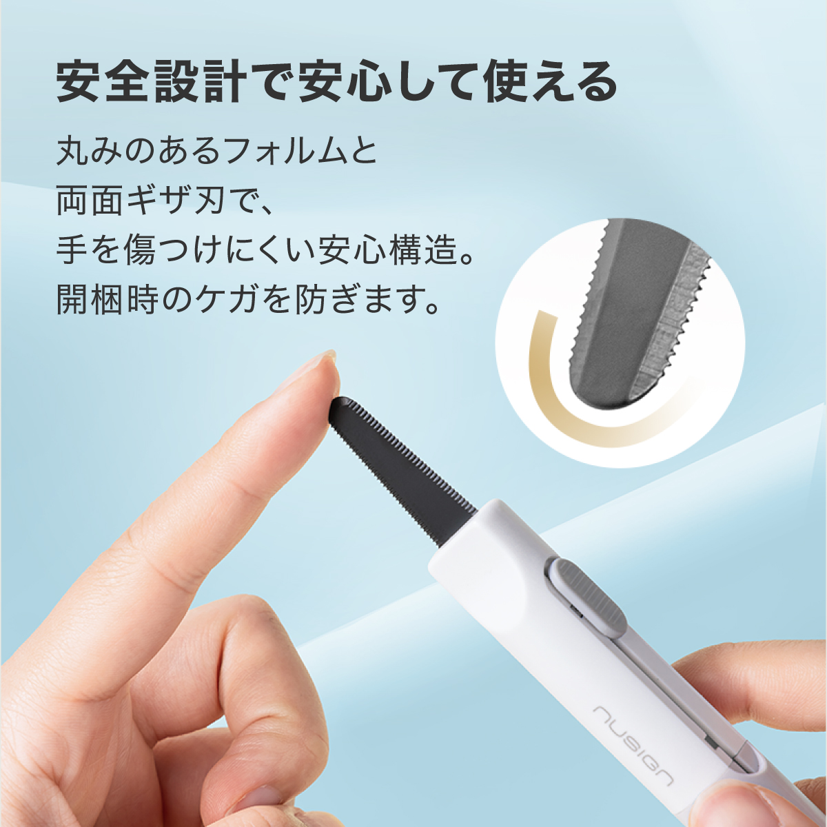 丸みのあるフォルムと両面ギザ刃で、手を傷つけにくい安心構造。開梱時のケガを防ぎます。