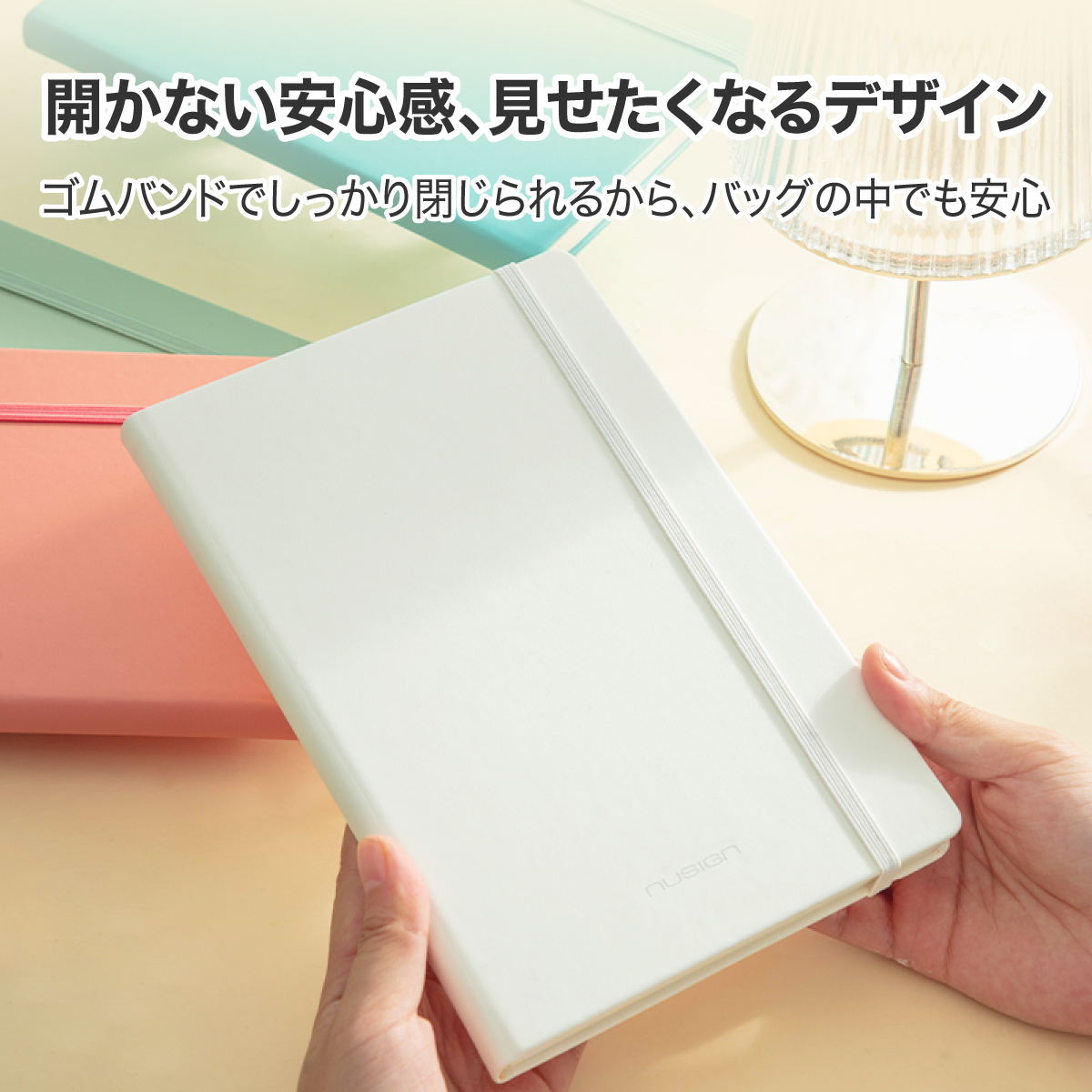 ゴムバンドでしっかり閉じられるから、バッグの中でも安心。
