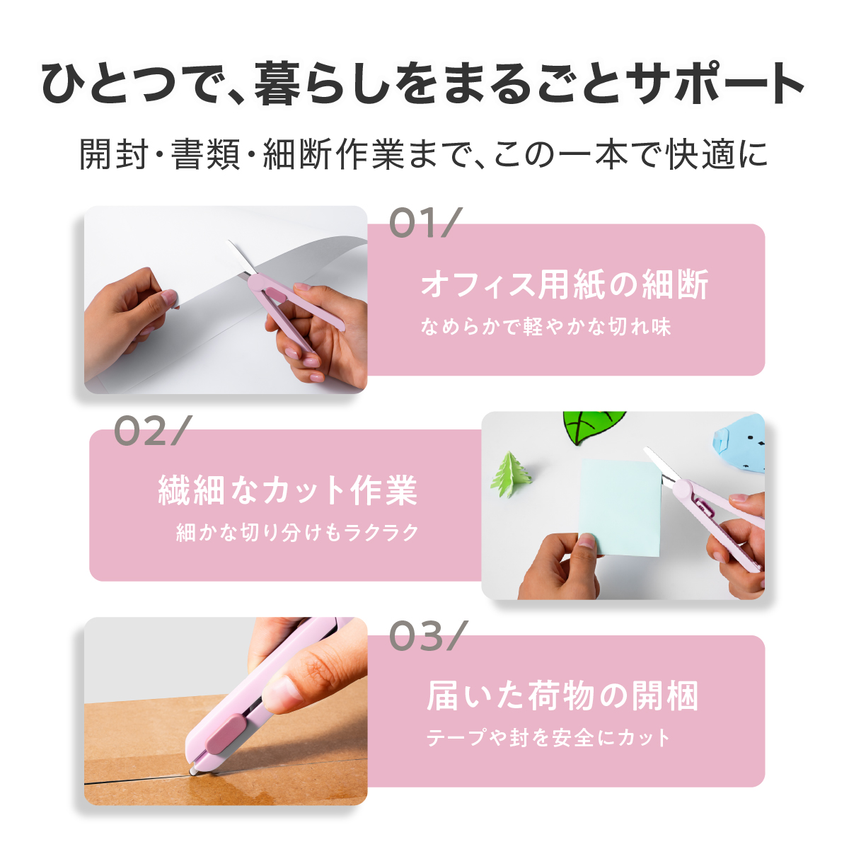 ボタンを反対にスライドするだけで、開梱に便利なミニカッターが利用できます。