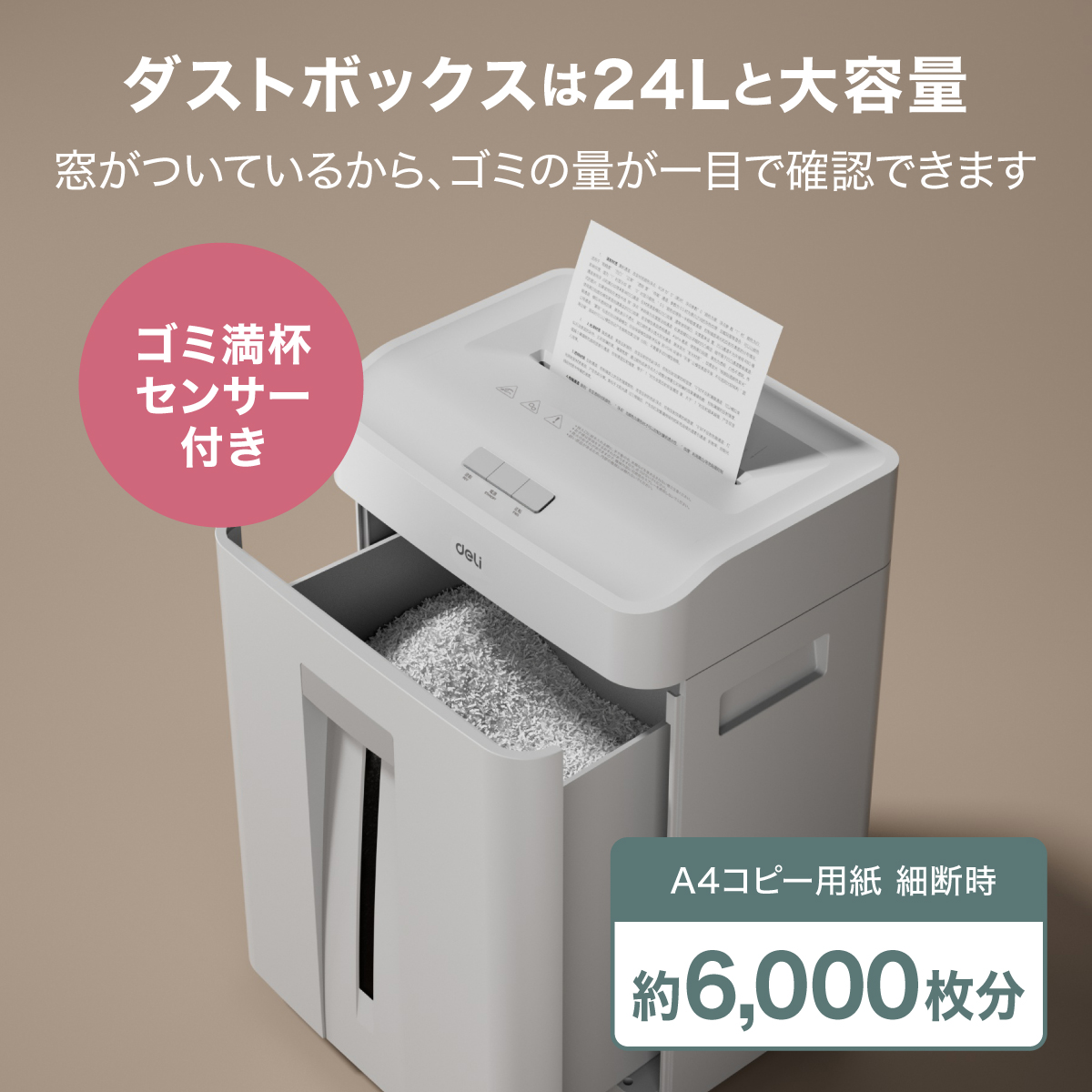 ・A4コピー用紙約6,000枚分・24Lの大容量ダストボックス。全面についた窓で細断量が一目で確認できます