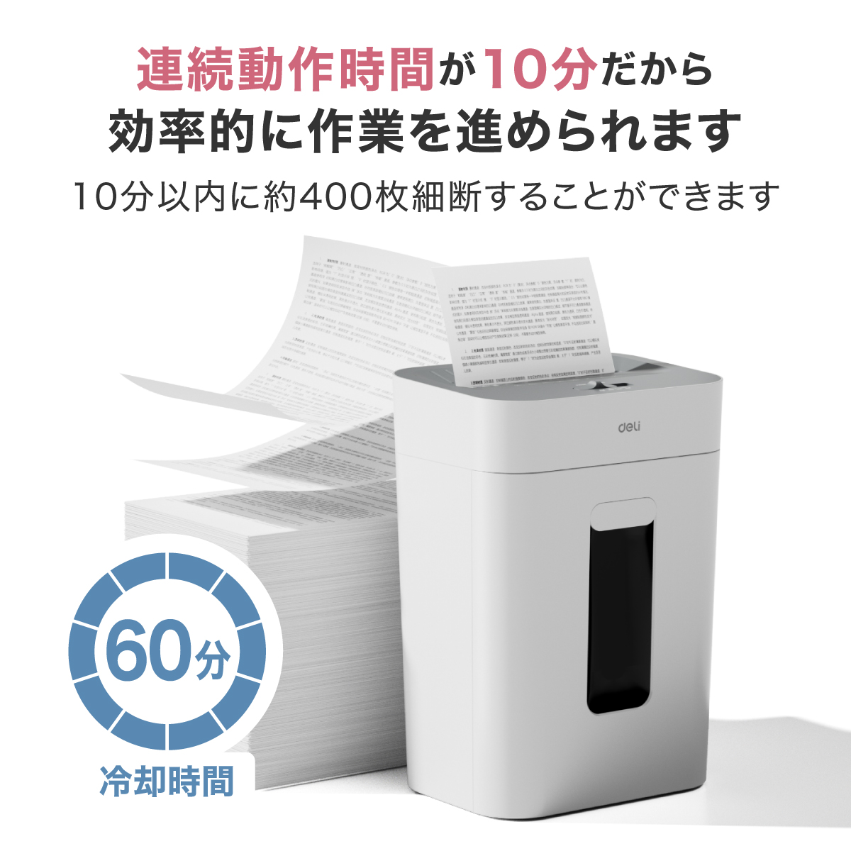 ・連続動作時間は10分。約400枚の細断が可能で、効率的に作業を進められます
